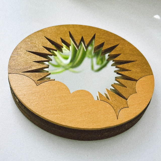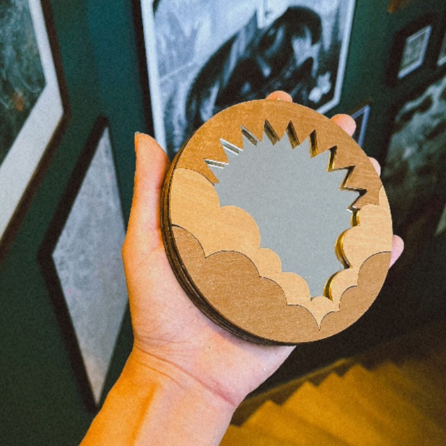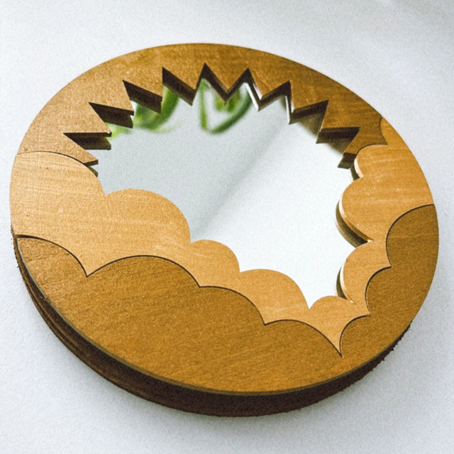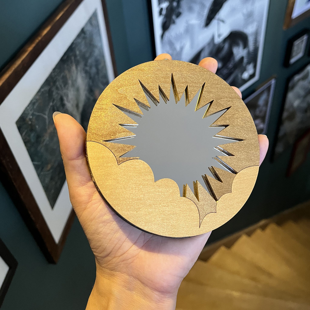 Miroir rond avec attache murale. Support en bois.